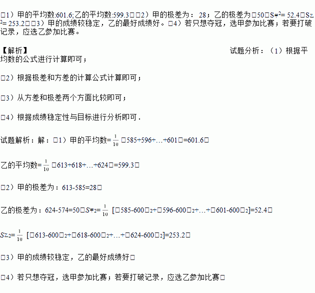 (2)甲、乙两名运动员这10次比赛成绩的极差、方差分别是多少?