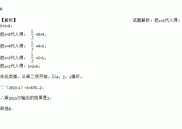 B 【解析】试题解析:把x=5代入得:5+3=8, 把x=8代入得: ×8=4, 把x=4代入得: ×4=2, 把x=2代入得: ×2=1, 把x=1代入得:1+3=4, 依此类推,从第二项开始,以4,2,1循环, ∵(2013-1)÷3=670…2, ∴第2013次输出的结果是2, 故选B.