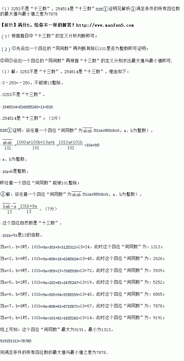 ②若一个四位自然数既是“十三数”,又是“间同数”,求满足条件的所有四位数的最大值与最小值之差.
