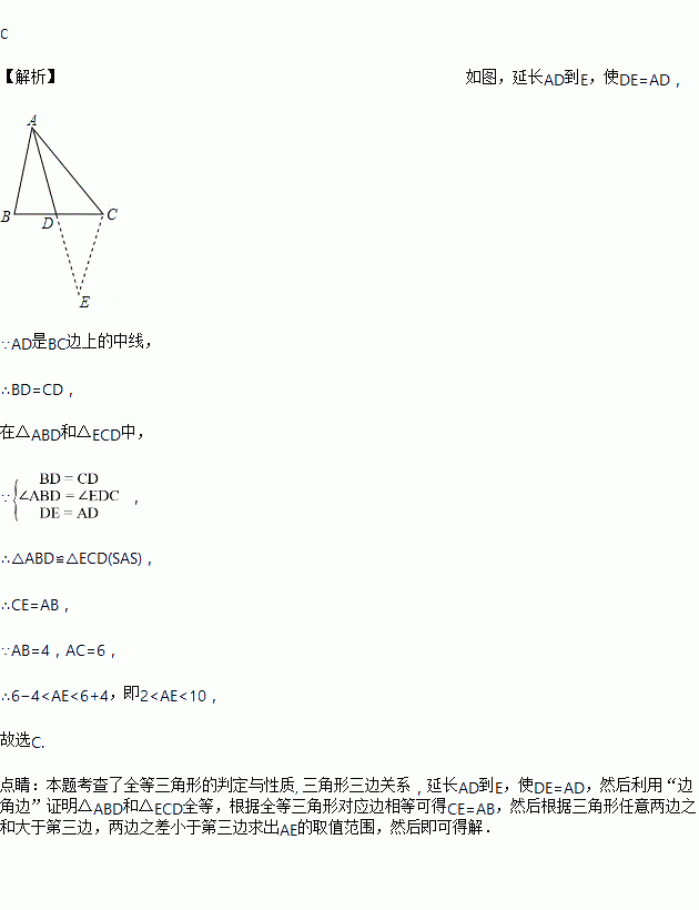 已知AD是△ABC中BC边上的中线,若AB=4,AC=6,则AD的取值范围是( )