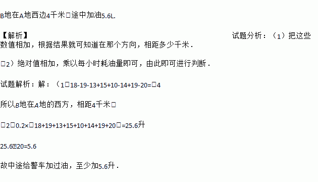 B地在A地西边4千米,途中加油5.6L. 【解析】试题分析:(1)把这些数值相加,根据结果就可知道在那个方向,相距多少千米. (2)绝对值相加,乘以每小时耗油量即可,由此即可进行判断. 试题解析:【解析】 (1)18-19-13+15+10-14+19-20=-4 所以B地在A地的西方,相距4千米; (2)0.2×(18+19+13+15+10+14+19+20)=...