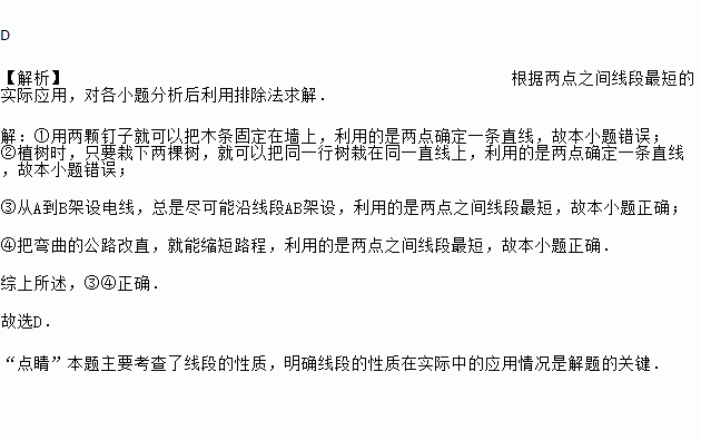 D ¡¾½âÎö¡¿¸ù¾ÝÁ½µãÖ®¼äÏß¶Î×î¶ÌµÄʵ¼ÊÓ¦Ó㬶Ը÷СÌâ·ÖÎöºóÀûÓÃÅųý·¨Çó½â£® ¡¾½âÎö¡¿ ¢ÙÓÃÁ½¿Å¶¤×ӾͿÉÒÔ°ÑľÌõ¹Ì¶¨ÔÚǽÉÏ£¬ÀûÓõÄÊÇÁ½µãÈ·¶¨Ò»ÌõÖ±Ïߣ¬¹Ê±¾Ð¡Ìâ´íÎó£» ¢ÚÖ²Ê÷ʱ£¬Ö»ÒªÔÔÏÂÁ½¿ÃÊ÷£¬¾Í¿ÉÒÔ°ÑͬһÐÐÊ÷ÔÔÔÚͬһֱÏßÉÏ£¬ÀûÓõÄÊÇÁ½µãÈ·¶¨Ò»ÌõÖ±Ïߣ¬¹Ê±¾Ð¡Ìâ´íÎó£» ¢Û´ÓAµ½B¼ÜÉèµçÏߣ¬×ÜÊǾ¡¿ÉÄÜÑØÏß¶ÎAB¼ÜÉ裬ÀûÓõÄÊÇÁ½µãÖ®¼äÏß¶Î×î¶Ì£¬¹Ê±¾Ð¡ÌâÕýÈ·£» ¢Ü°ÑÍäÇúµÄ¹«Â·¸ÄÖ±£¬¾ÍÄÜËõ¶Ì...