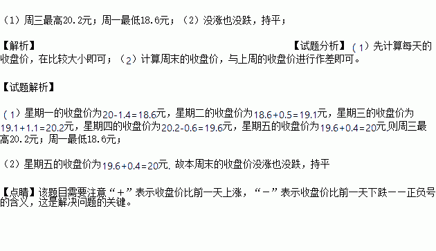 某支股票上周末的收盘价是20.00元,本周一到周五的收盘情况如下表所示: