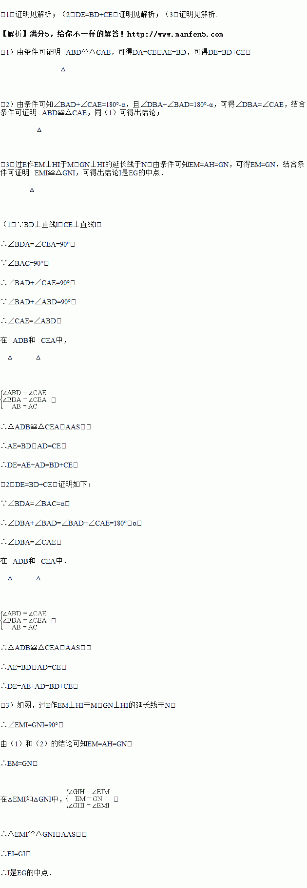 (3)数学老师赞赏了他们的探索精神,并鼓励他们运用这个知识来解决问题:如图③,过△ABC的边AB、AC向外作正方形ABDE和正方形ACFG,AH是BC边上的高,延长HA交EG于点I,求证:I是EG的中点.