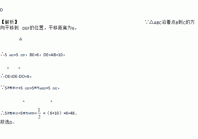 如图,将直角三角形ABC沿着点B到C的方向平移到三角形DEF的位置,DE与AC交于点O.若AB=10,DO=4,平移的距离为6,则阴影部分面积为( )