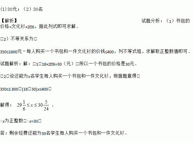 (1)30元;(2)30名 【解析】试题分析:(1)书包的价格=文化衫×2﹣6,据此列式即可求解. (2)不等关系为: 350≤1800元﹣每人购买一个书包和一件文化衫的价钱≤400,列不等式组,求解取正整数值即可. 试题解析:【解析】 (1)18×2﹣6=30(元),所以一个书包的价格是30元. (2)设还能为x名学生每人购买一个书包和一件文化衫,根据题意得: ...