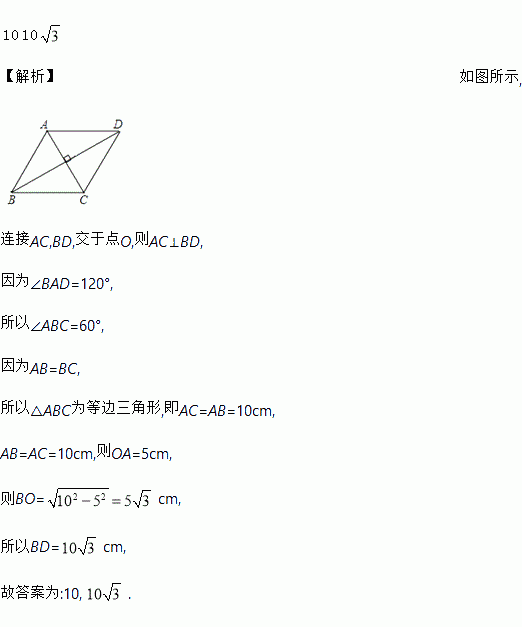 菱形ABCD中,如下图,∠BAD=120°,AB=10 cm,则AC=______ cm,BD=_______ cm.