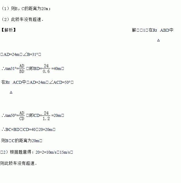 ¾Ýµ÷²é£¬³¬ËÙÐÐÊ»ÊÇÒý·¢½»Í¨Ê¹ʵÄÖ÷ÒªÔÒòÖ®Ò»£¬ËùÒԹ涨ÒÔÏÂÇé¾³ÖеÄËٶȲ»µÃ³¬¹ý15m/s£¬ÔÚÒ»Ìõ±ÊÖ±¹«Â·BDµÄÉÏ·½A´¦ÓÐһ̽²âÒÇ£¬Èçͼ£¬AD=24m£¬¡ÏD=90¡ã£¬µÚÒ»´Î̽²âµ½Ò»Á¾½Î³µ´ÓBµãÔÈËÙÏòDµãÐÐÊ»£¬²âµÃ¡ÏABD=31¡ã£¬2Ãëºóµ½´ïCµã£¬²âµÃ¡ÏACD=50¡ã.