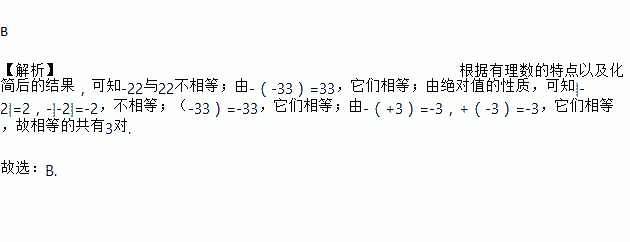 B 【解析】根据有理数的特点以及化简后的结果,可知-22与22不相等;由-(-33)=33,它们相等;由绝对值的性质,可知|-2|=2,-|-2|=-2,不相等;(-33)=-33,它们相等;由-(+3)=-3,+(-3)=-3,它们相等,故相等的共有3对. 故选:B.