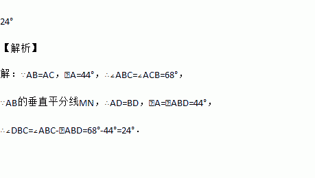 如图,已知AB=AC,∠A=440,AB的垂直平分线MN交AC于点D,则∠DBC=