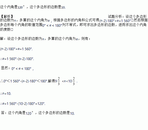 某同学在求多边形的内角和时,多算了一个内角的度数,求得内角和为1 560°,问这个内角是多少度?这个多边形的边数是多少?