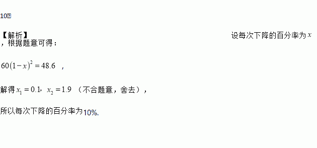 某种药品原来售价60元,连续两次降价后售价为48.6元,若每次下降的百分率相同,则这个百分率是_____.