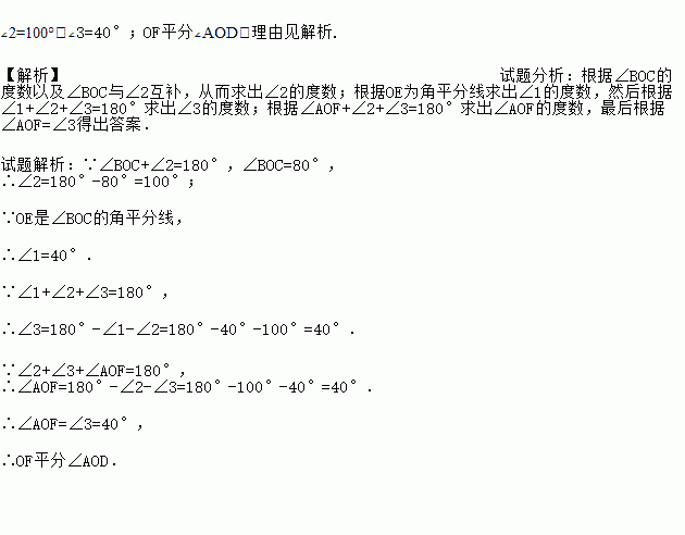 如图所示,直线AB、CD相交于点O,且∠BOC=80°,OE平分∠BOC.OF为OE的反向延长线.求∠2和∠3的度数,并说明OF是否为∠AOD的平分线.