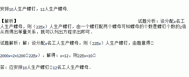 安排10人生产螺钉,12人生产螺母. 【解析】试题分析:设分配x名工人生产螺母,则(22﹣x)人生产螺钉,由一个螺钉配两个螺母可知螺母的个数是螺钉个数的2倍从而得出等量关系,就可以列出方程求出即可. 试题解析:【解析】 设分配x名工人生产螺母,则(22﹣x)人生产螺钉,由题意得: 2000x=2×1200(22﹣x),解得:x=12,则22﹣x=10. 答:应安排10人生...