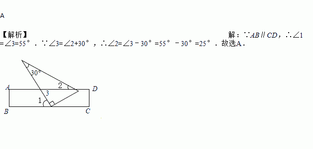 如图,将一块含有30°角的直角三角板的两个顶点放在矩形直尺的一组对边上.若∠1=55°,则图中∠2的大小为( )