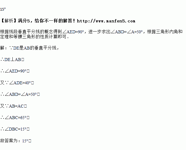 如图,在△ABC中,AB=AC,AB的垂直平分线交AC于D,交AB于E,连接BD,若∠ADE=40°,则∠DBC=_____.