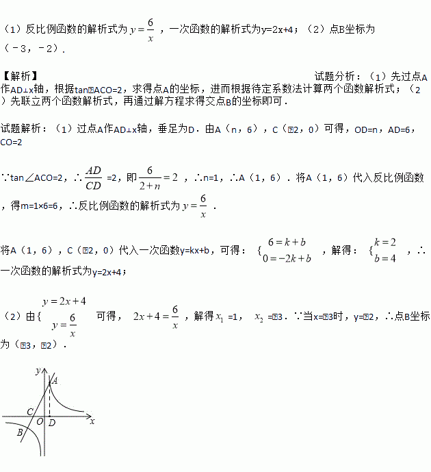 (m≠0)的图象交于A、B两点,与x轴交于C点,点A的坐标为(n,6),点C的坐标为(﹣2,0),且tan∠ACO=2.