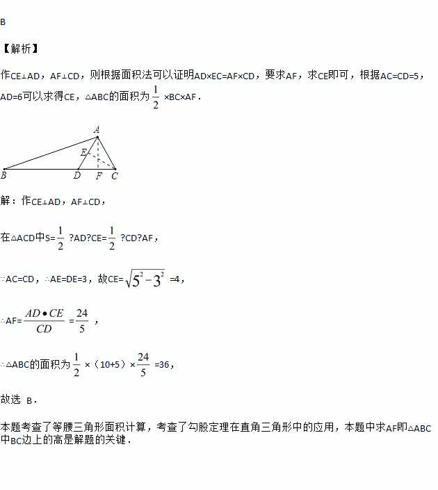 在三角形ABC中,D是边BC上的一点,已知AC=5,AD=6,BD=10,CD=5,那么三角形ABC的面积是( )