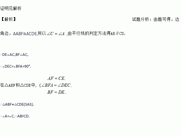 如图所示,DE⊥AC,BF⊥AC,垂足分别为E,F, DE=BF,AF=CE.求证:AB∥CD.