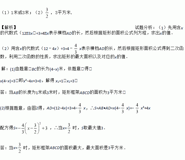 (1)在图①中,如果不锈钢材料总长度为12米,当x为多少时,矩形框架ABCD的面积为3平方米?