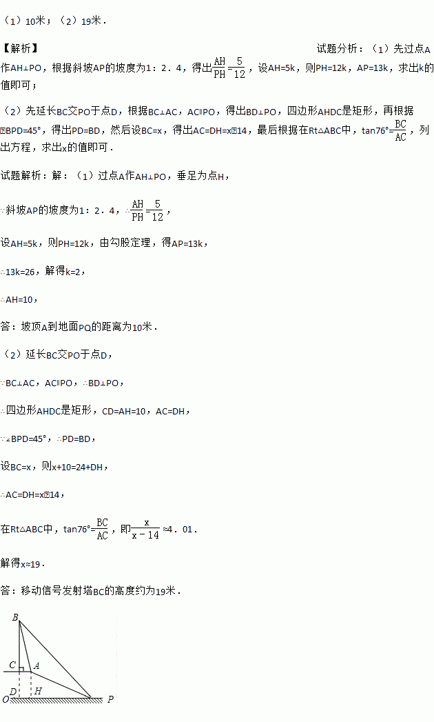 已知,如图,在坡顶A处的同一水平面上有一座古塔BC,数学兴趣小组的同学在斜坡底P处测得该塔的塔顶B的仰角为45°,然后他们沿着坡度为1:2.4的斜坡AP攀行了26米,在坡顶A处又测得该塔的塔顶B的仰角为76°.