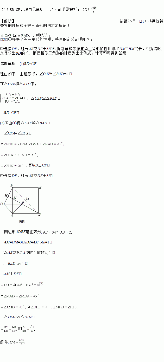 (2)当△ABC绕点A逆时针旋转45°时,如图③,延长DB交CF于点H;