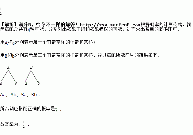 一天晚上,小伟帮助妈妈清洗两个只有颜色不同的有盖茶杯,突然停电了,小伟只好把杯盖和茶杯随机地搭配在一起,则颜色搭配正确的概率是_____.