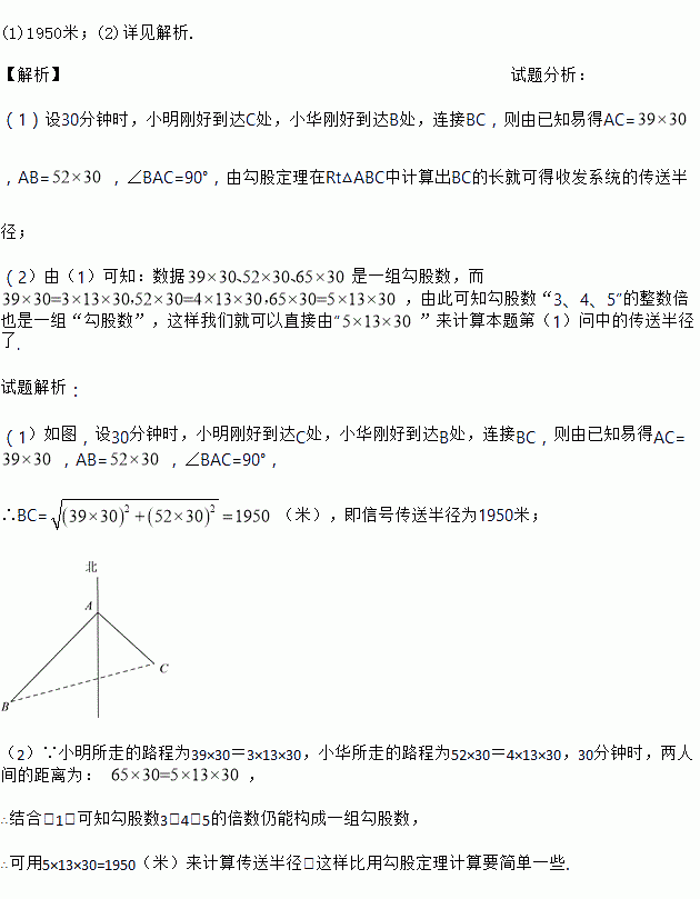 学校科技小组研制了一套信号发射、接收系统.在对系统进行测试中,如图,小明从路口A处出发,沿东南方向笔直公路行进,并发射信号,小华同时从A处出发,沿西南方向笔直公路行进,并接收信号.若小明步行速度为39米/分,小华步行速度为52米/分,恰好在出发后30分时信号开始不清晰.