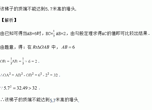 生活经验表明,靠墙摆放梯子时,若梯子底端离墙的距离约为梯子长度的时,梯子比较稳定.如图AB是一长度为6米并且已经稳定摆放的梯子.试说明它的顶端能否达到5.7米高的墙头?