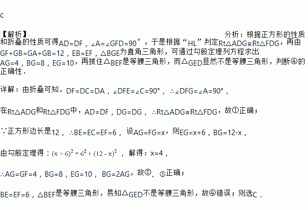 ,延长EF交边AB于点C,连接DG,BF,给出以下结论:![]()