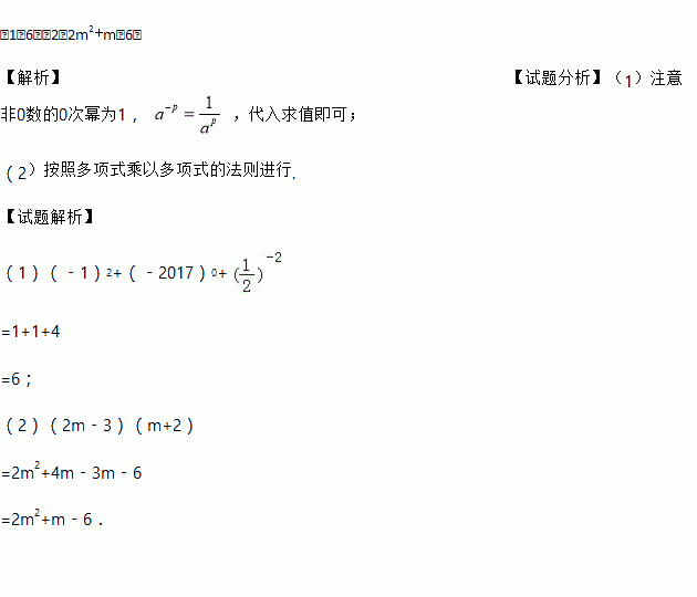 计算:(1)(﹣1)2+(﹣2017)0+; (2)(2m﹣3)(m+2).