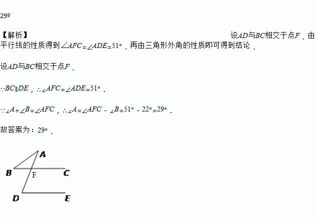 如图,BC∥DE,已知∠B=22º,∠D=51º,则∠A=________。