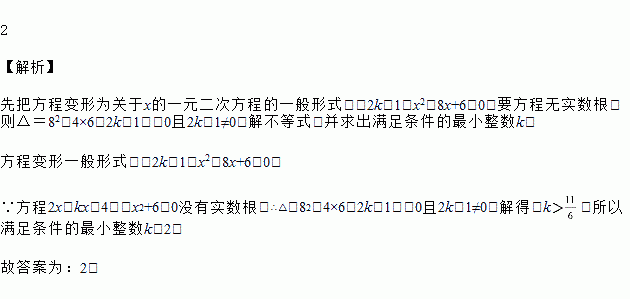 如果关于x的一元二次方程2x(kx-4)-x2+6=0没有实数根,那么k的最小整数值是________.