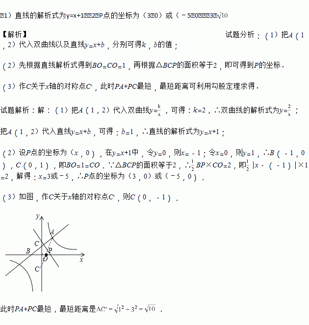(k是常数,k≠0)在第一象限内交于点A(1,2),且与x轴、y轴分别交于B,C两点.点P在x轴.