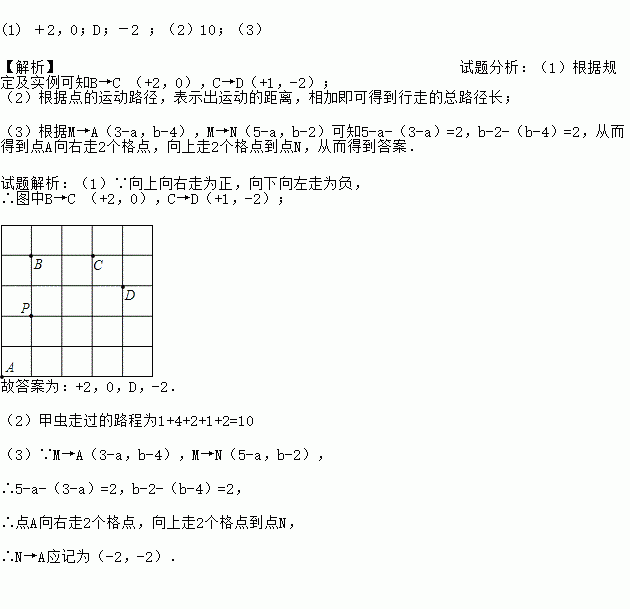 Èçͼ£¬Ò»Ö»¼×³æÔÚ5¡Á5µÄ·½¸ñ(ÿС¸ñ±ß³¤Îª1)ÉÏÑØ×ÅÍø¸ñÏßÔ˶¯£®Ëü´ÓA´¦³ö·¢È¥¿´ÍûB£¬C£¬D´¦µÄÆäËû¼×³æ£¬¹æ¶¨£ºÏòÉÏÏòÓÒ×ßΪÕý£¬ÏòÏÂÏò×ó×ßΪ¸º£®Èç¹û´ÓAµ½B¼ÇΪ£ºA¡úB(£«1£¬£«4)£¬´ÓBµ½A¼ÇΪ£ºB¡úA(£1£¬£4)£¬ÆäÖеÚÒ»¸öÊý±íʾ×óÓÒ·½Ïò£¬µÚ¶þ¸öÊý±íʾÉÏÏ·½Ïò£®