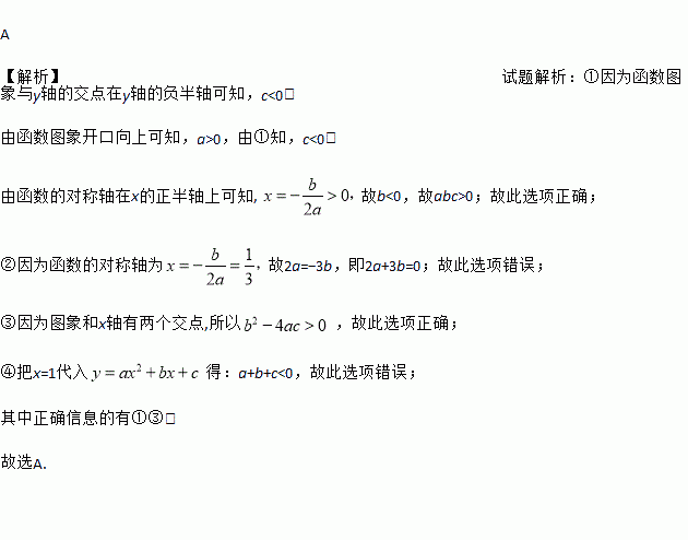 A 【解析】试题解析:①因为函数图象与y轴的交点在y轴的负半轴可知,c<0, 由函数图象开口向上可知,a>0,由①知,c<0, 由函数的对称轴在x的正半轴上可知, 故b<0,故abc>0;故此选项正确; ②因为函数的对称轴为故2a=?3b,即2a+3b=0;故此选项错误; ③因为图象和x轴有两个交点,所以,故此选项正确; ④把x=1代入得:a+b+c<0,故此选...
