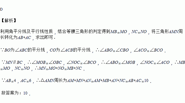 如图,在△ABC中,AB=4,AC=6,∠ABC和∠ACB的平分线交于O点,过点O作BC的平行线交AB于M点,交AC于N点,则△AMN的周长为( )