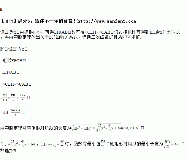 如图,锐角中,于,,,是边上的动点,作矩形,使在边上,在边上,则矩形的对角线的最小值是( )
