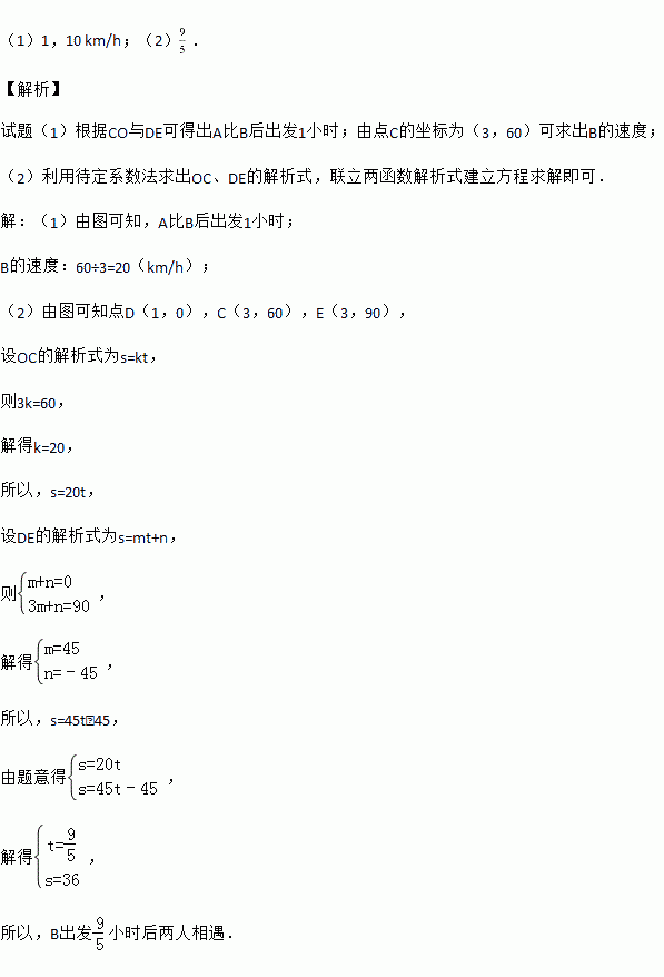 已知甲、乙两地相距90km,A,B两人沿同一公路从甲地出发到乙地,A骑摩托车,B骑电动车,图中DE,OC分别表示A,B离开甲地的路程s(km)与时间t(h)的函数关系的图象,根据图象解答下列问题.