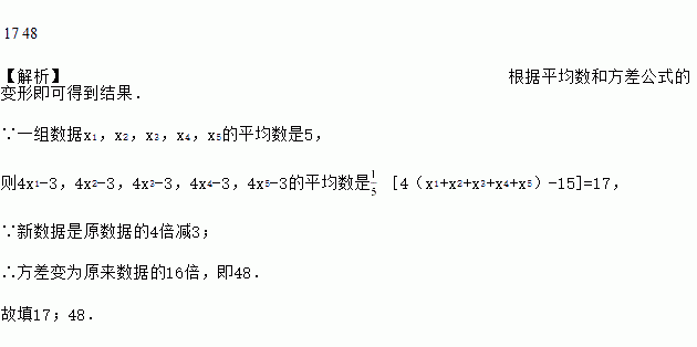 一组数据x1,x2,x3,x4,x5的平均数是5,方差是3,则4x1﹣3,4x2﹣3,4x3﹣3,4x4﹣3,4x5﹣3的平均数是_____,方差是_____.