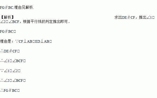 如图所示,已知CF⊥AB于点F,ED⊥AB于点D,∠1=∠2,猜想FG和BC的位置关系,并说明理由.