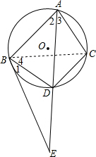 17.分析 连接BC,由BE与⊙O相切于点B,得到∠1=∠2,证得△ABE∽△EDB,得到比例式$\frac{AB}{BD}=\frac{AE}{BE}$,由于AB•BE=AE•DC,得到比例式$\frac{AB}{CD}=\frac{AE}{BE}$,于是BD=CD,证得∠2=∠3,通过等量代换可得BD是∠CBE的平分线.