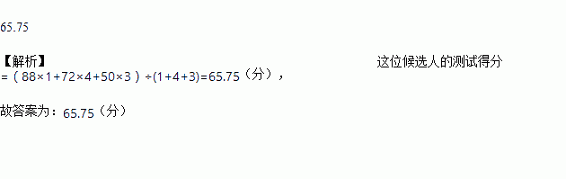 某公司欲招聘工人,对候选人进行三项测试:语言、创新、综合知识,并将测试得分按1∶4∶3的比确定测试总分.已知某位候选人的三项得分分别为88,72,50,则这位候选人的测试总分为________.