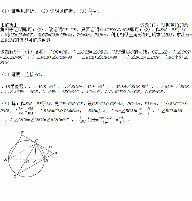 ,点E为线段OB上一点(不与O,B重合),作CE⊥OB,交⊙O于点C,垂足为点E,作直径CD,过点C的切线交DB的延长线于点P,AF⊥PC于点F,连接CB.