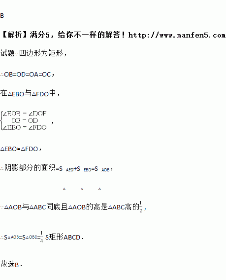 如图所示,EF过矩形ABCD对角线的交点O,且分别交AB、CD于点E、F,那么阴影部分的面积是矩形ABCD面积的( )