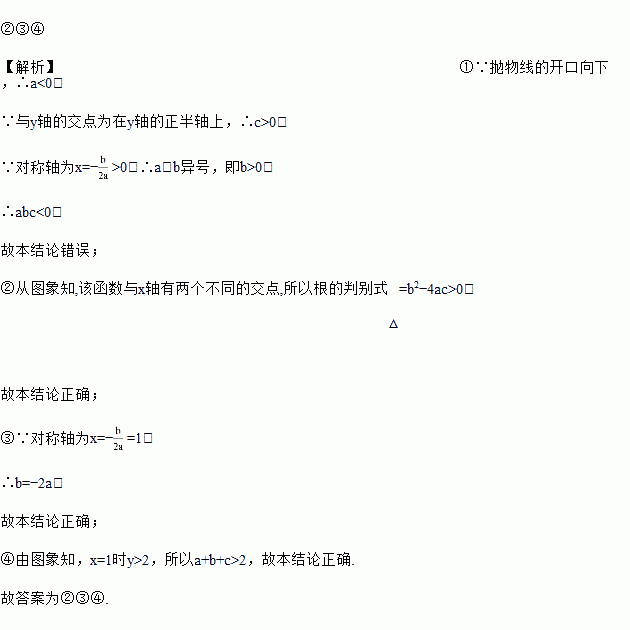 ①abc>0;②b2-4ac>0;③b=-2a;④a+b+c>2.其中正确的是______(填写序号)