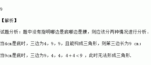 等腰三角形的两条边长分别为4cm和9cm,则第三边长为 cm.