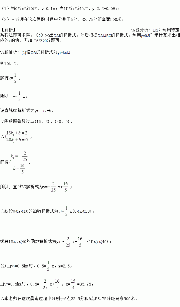 (1)当0≤x≤10时,y=0.1x;当15≤x≤40时,y=3.2-0.08x; (2)李老师在这次晨跑过程中分别于5分、33.75分距离家500米。 【解析】试题分析:(1)利用待定系数法即可求得;(2)求出OA的解析式,然后根据OA、BC的解析式,利用y=0.5千米计算求出相应的x的值,再加上6点20分即可. 试题解析:(1)设OA的解析式为y1=kx, 则10k=2...