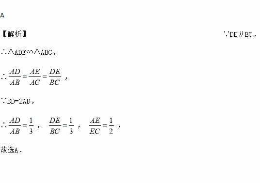 如图,在△ABC中,点D、E分别在边AB、AC上,DE∥BC,若BD=2AD,则( )