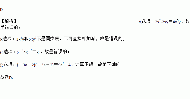 C. x-1÷x-2=x-1 D. (-3a-2)(-3a+2)=9a2-4